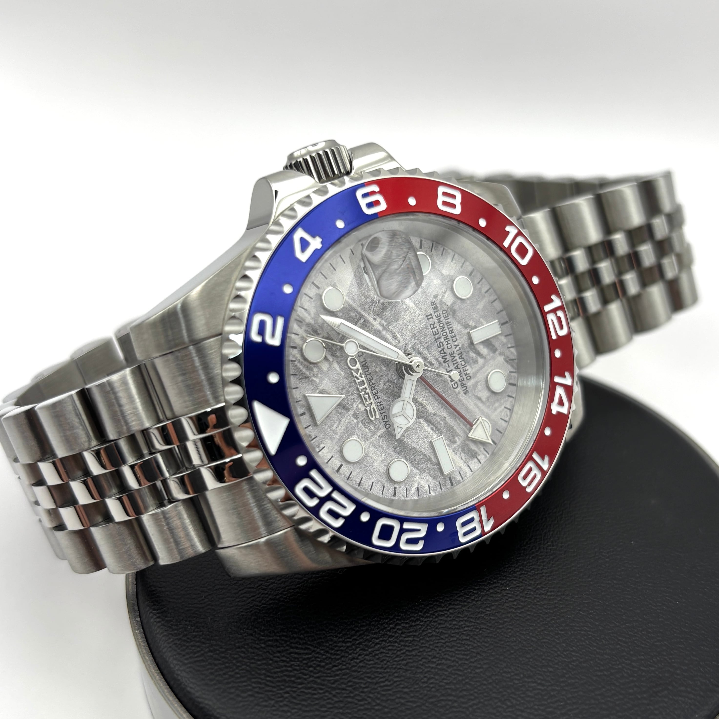 アイコニックなGMTマスターⅡのデザインにインスパイアされた、セイコーの自動巻きムーブメントNH34を搭載したセイコーMODGMTマスター。 卓越した技術と使いやすさの完璧な融合を実現した、40mmのハイエンド・クオリティ・ウォッチです。